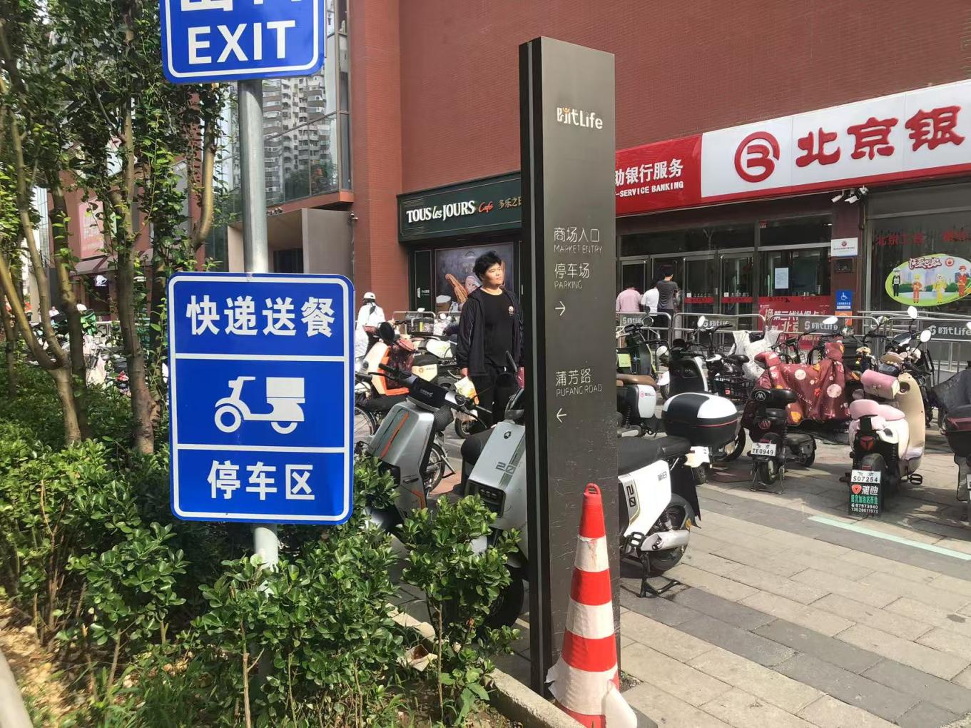 记者环顾四周,发现在商场门前其实专门设置了一片非机动车停车区,并立有“快递送餐停车区”的牌子,里面非机动车停得满满当当,却难见外卖骑手的电动车。现场一位管理人员说,商场门前停车空间不足,无论是来这儿上班的,还是购物的,各方都有停车需求,虽然立了牌子,但也没法限制骑手以外的人停车。