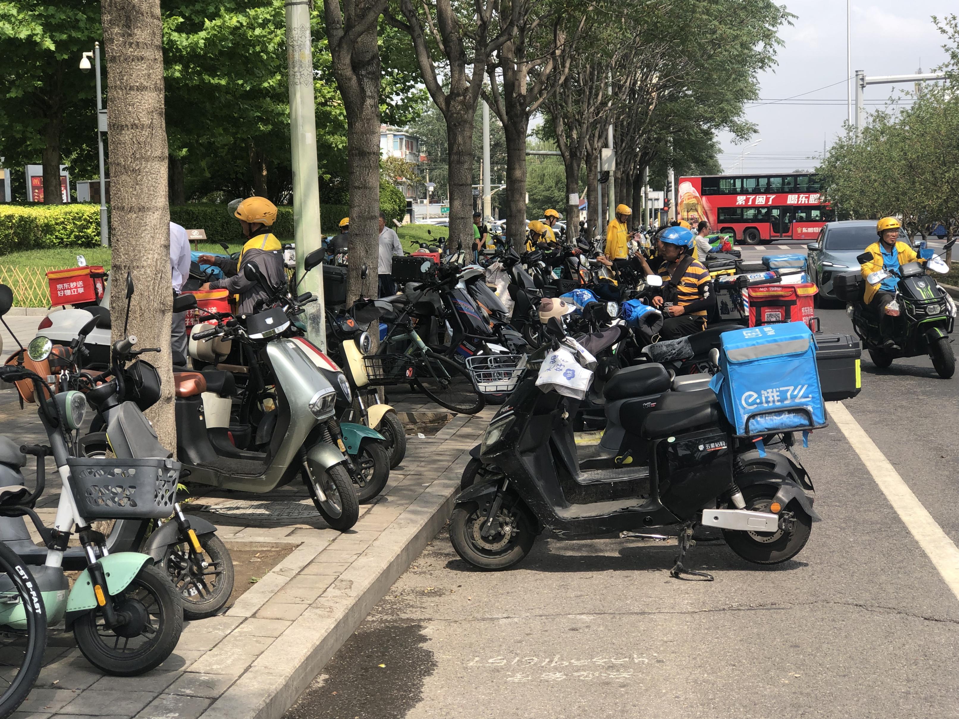 很多骑手道出了个中无奈:天气太热,他们只能尽量找便道上的树荫避暑,“便道旁还有很多别的车,我们的车一旦上了便道,就被挡住下不去了,而且道路窄也掉不了头,只好在便道上骑到十字路口。”