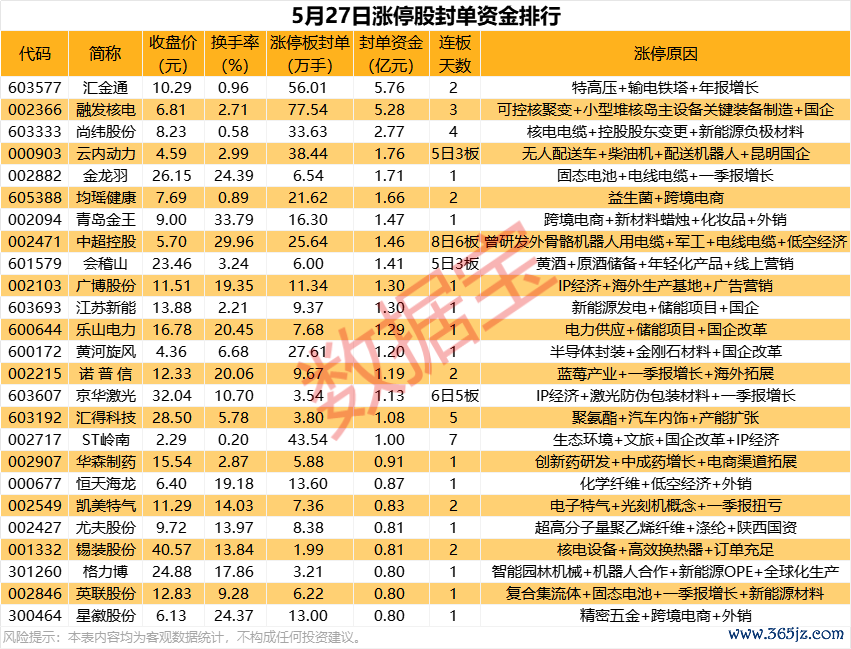从收盘涨停板封单量来看,融发核电封单量最高,有77.54万手;其次是汇金通、ST岭南、云内动力,涨停板封单分别为56.01万手、43.54万手、38.44万手。